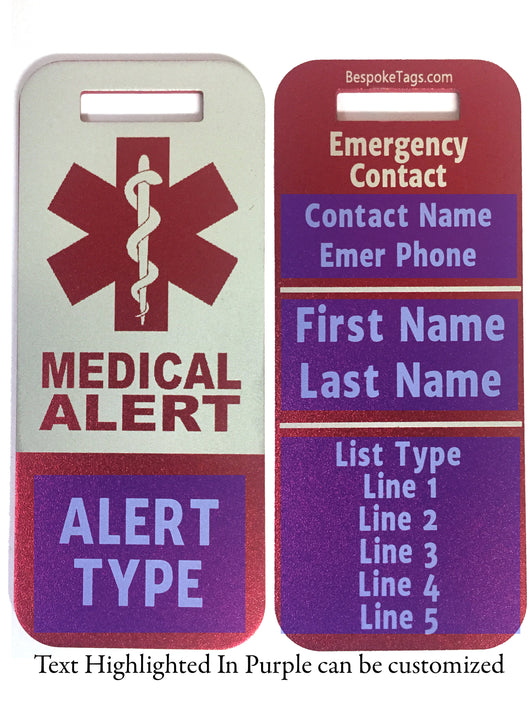 Compact size with a custom condition and contact information, our Medical Alert tags are made from anodized aluminum with a rectangular strap slot and custom etched with your details, this luggage tag is the perfect size for all your bags! This size is especially well suited for carry-ons, backpacks, briefcases, purses, and other frequently handled bags.